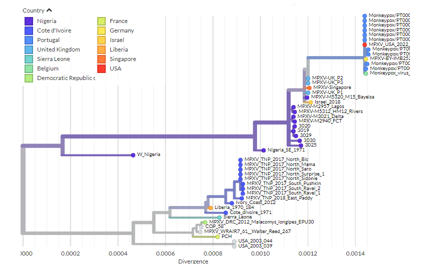 Предварительный филогенетический анализ показал, что вирус 2022 года относится к западноафриканской кладе и наиболее тесно связан с вирусами, экспортированными в 2018 и 2019 годах из Нигерии в Великобританию, Израиль и Сингапур. Авторы сразу же отметили, что данные предварительные и будут обновляться. Вирусы западноафриканской клады вызывают более легкое заболевание, чем конголезская клада (летальность при отсутствии лечения и ухода может достигать 3,6% и 10–11% соответственно).