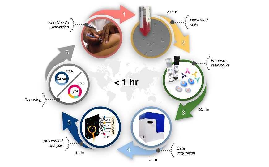 Международная группа исследователей представила аппарат CytoPAN, способный в автоматическом режиме обнаруживать раковые клетки в биоптате и проводить молекулярное профилирование опухоли. Протестированный на 68 пациентках, прибор показал 93–96% точность в определении подтипа опухоли.