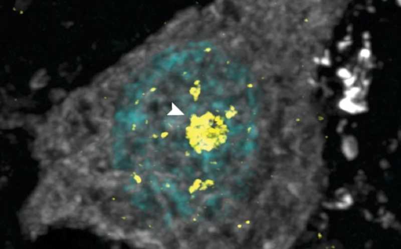 Агрегаты TDP-43 в нейроне пациента с болезнью Гентингтона.