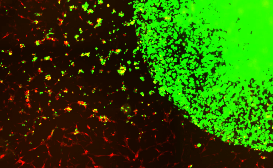 Инкапсулированные в гидрогеле стволовые клетки (зеленые) отслеживают и уничтожают клетки глиобластомы (красные)