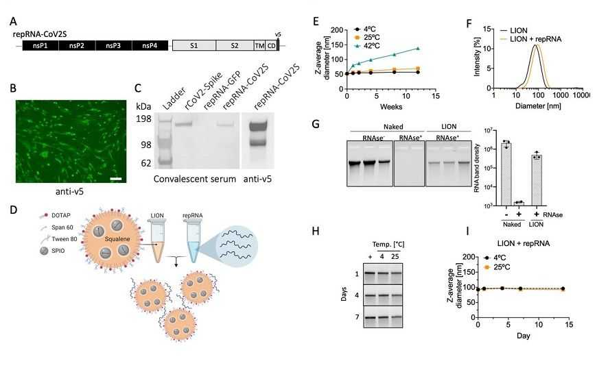 Другая особенность вакцины помимо репликации — ее РНК связана с наночастицами нового поколения LION (Lipid InOrganic Nanoparticles). Это эмульсия, состоящая из углеводорода сквалена с наночастицами оксида железа в липидных оболочках. При простом смешивании с мРНК наночастицы образуют стабильные комплексы, которые сохраняются при комнатной температуре минимум неделю. Таким образом, вакцину удобно транспортировать, разделив компоненты, а затем, смешав, хранить достаточное время.