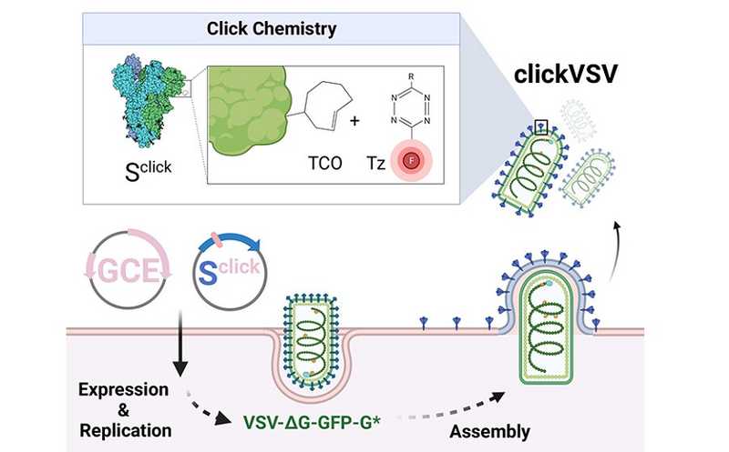 Исследователи из Германии создали вирус везикулярного стоматита для моделирования коронавируса SARS-CoV-2 и других патогенов, который можно метить с помощью клик-химии. Частицы псевдовируса несут S-белок SARS-CoV-2, содержащий неканоническую аминокислоту, а она вступает в клик-реакцию с флуоресцентным красителем. Это позволило визуализировать большее количество молекул белка по сравнению с методами иммунохимии и наблюдать инфицирование вирусом живых клеток, в том числе визуализировать процесс инфекции в трех измерениях.