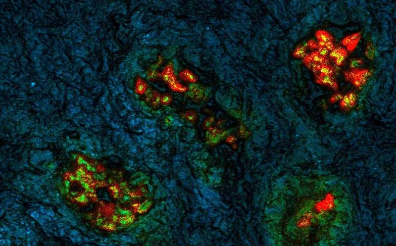 Колоректальный рак. Опухолевые клетки имеют более долгое FLT и обозначены красным, здоровые ткани — синим и зеленым.