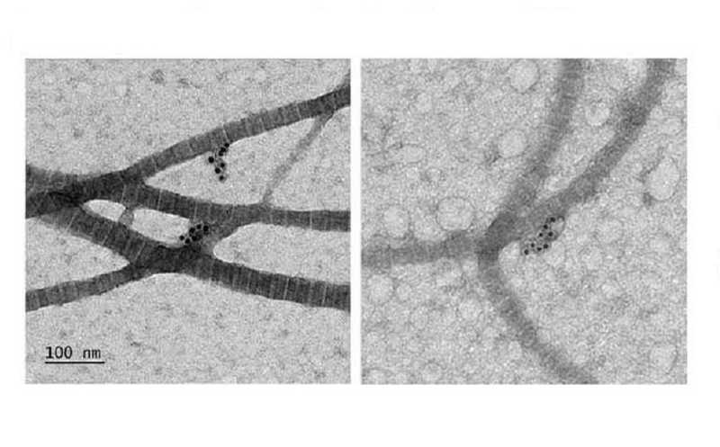 Агрегаты медина на коллагеновых волокнах аорты человека (иммуноэлектронная микроскопия)
