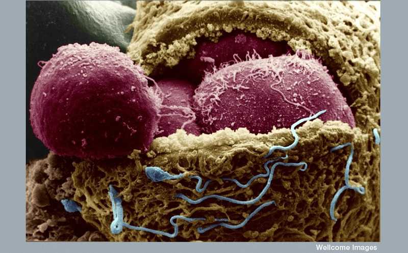 Сканирующая электронная микрофотография человеческого эмбриона на 4-й день. Оболочка, окружающая яйцо (zona pellucida, желтый цвет), надрезана и открывает эмбриональные клетки (бластомеры). Снаружи все еще видны многочисленные сперматозоиды (синий) |