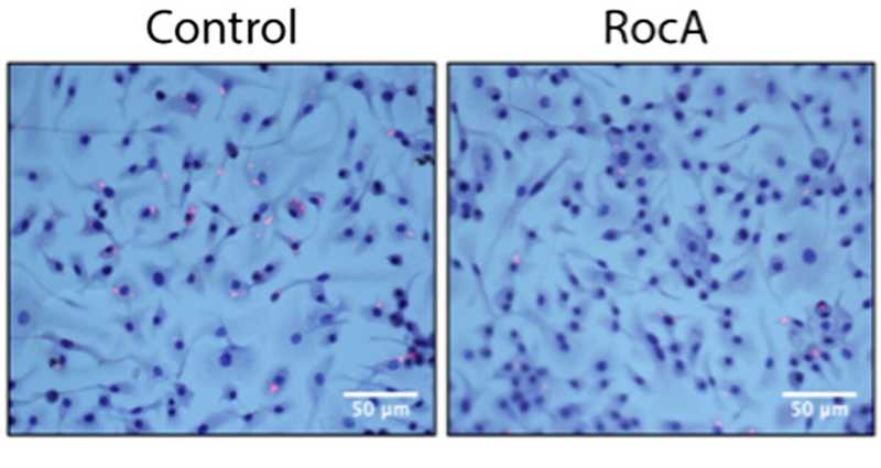 Обработка макрофагов рокагламидом А (RocA) уменьшила количество внутриклеточной Mycobacterium tuberculosis (окрашена розовым).Credit: