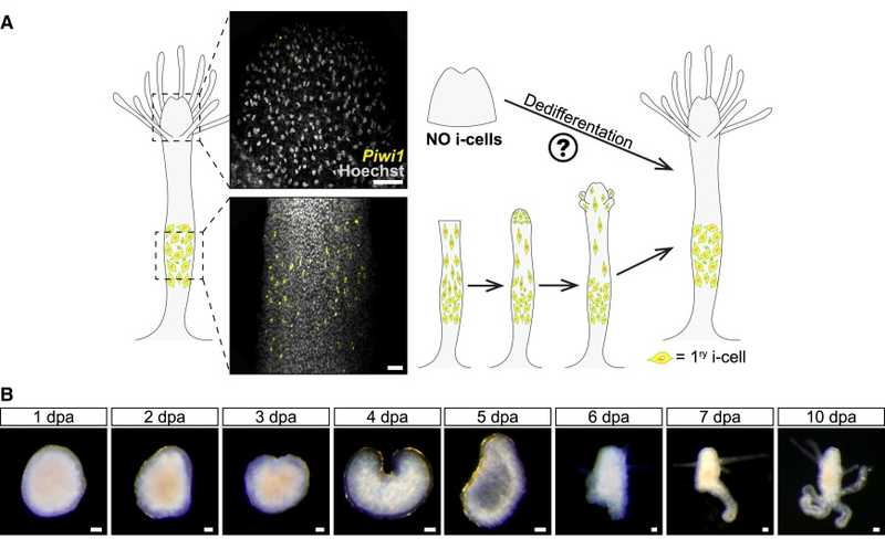 Ученые убедились, что в гипостоме гидрактинии исходно нет i-клеток, маркером которых был Piwi1 — ген одного из регуляторных РНК-связывающих белков, участвующих в дифференцировке клеток у многих организмов. Однако после начала регенерации фрагмент полипа уже содержал Piwi1-позитивные клетки. Такие i-клетки авторы обозначили как вторичные.
