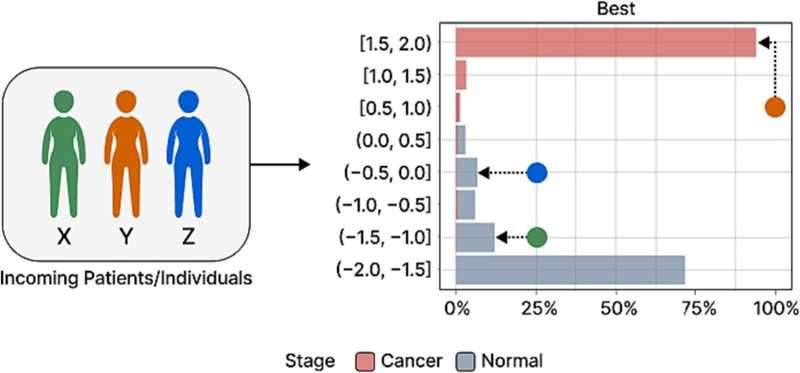 При диагностике рака яичников, основанной на предложенном методе машинного обучения, возможно несколько сценариев. Профиль метаболитов X попадает в диапазон баллов, где ошибочный диагноз маловероятен, что позволяет с уверенностью исключить рак. Профиль метаболитов Y лежит в диапазоне, в котором у 94 % других людей с таким показателем был диагностирован рак. И наконец, определение онкологического статуса Z может оказаться сложной задачей, поскольку в этом диапазоне баллов всего несколько образцов, и он находится в середине распределения.Credit: