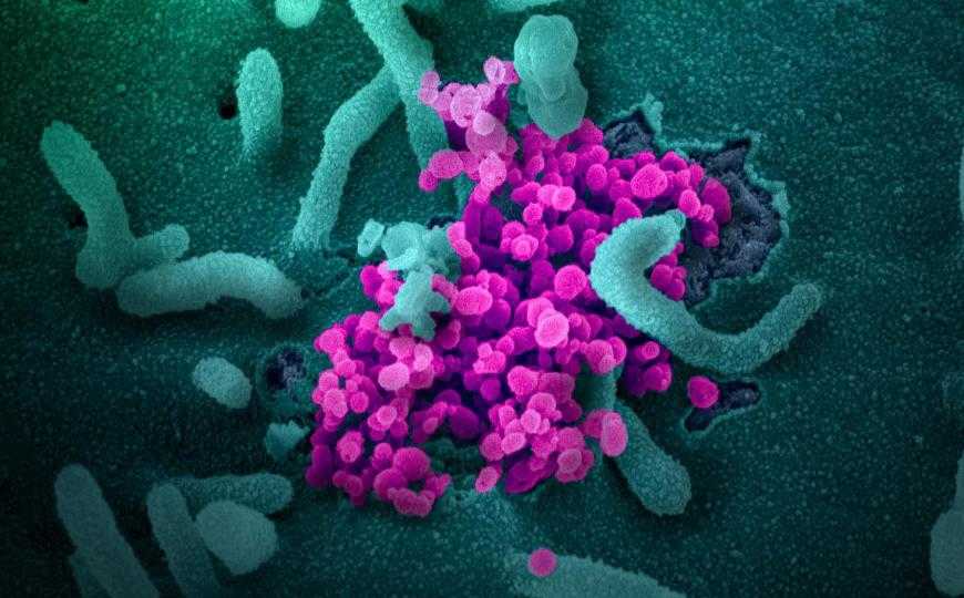 Новый коронавирус SARS-CoV-2 (круглые объекты малинового цвета на поверхности клетки). Сканирующая электронная микроскопия.