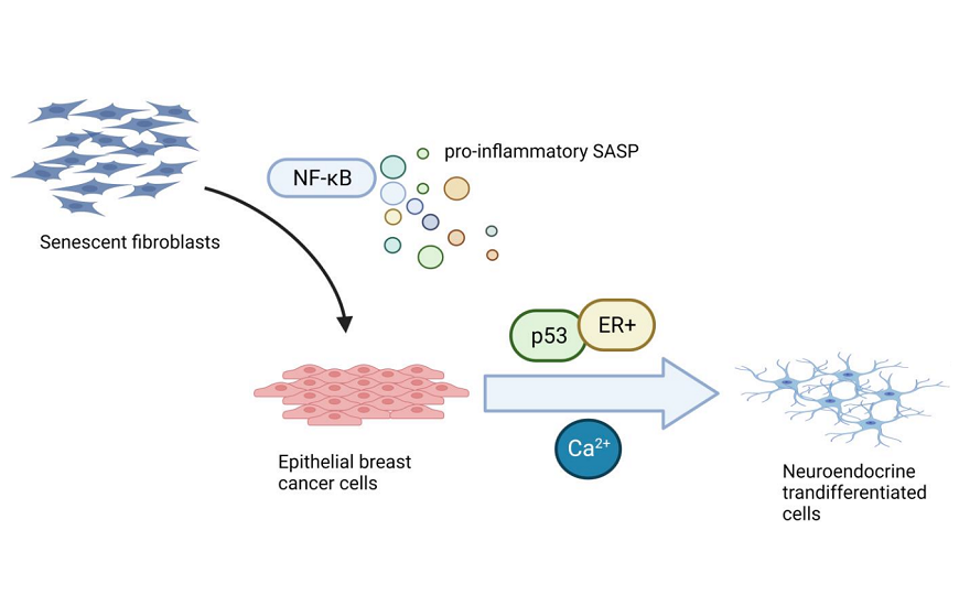 Сенесцентные клетки — это стареющие или поврежденные клетки, безвозвратно утратившие способность к делению. Они могут накапливаться в различных тканях и органах, способствуя старению и возрастным заболеваниям. Для этих клеток характерен так называемый сенесцентно-ассоциированный секреторный фенотип (SASP); они выделяют молекулы, которые могут оказывать как благотворное, так и пагубное влияние на окружающие клетки и ткани. Например, такие молекулы могут стимулировать сенесцентность в окружающих клетках, стимулировать или подавлять стволовость клеток, модифицировать внеклеточный матрикс, активировать или подавлять иммунный ответ, а также стимулировать эпителиально-мезенхимальный переход, способствуя миграции клеток. Исследователи из Франции обнаружили новую роль SASP: сенесцентные фибробласты могут стимулировать дифференцировку опухолевых клеток рака молочной железы (РМЖ) в нейроэндокринные клетки. Этот процесс называется нейроэндокринной трансдифференциацией (НЭТ). Известно, например, что такие клетки участвуют в возникновении резистентности к терапии в раке простаты.