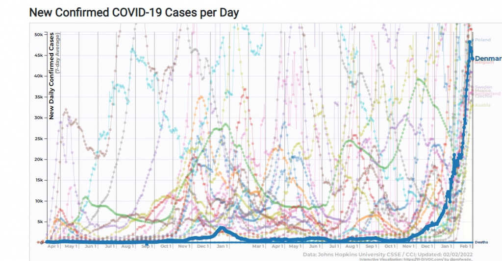 Дания, вероятно, уже прошла пик омикрона без значительного подъема смертности. В Москве, по данным ЦСП ФМБА, на прошлой неделе 95,6% случаев коронавирусной инфекции, для которой определен штамм, были вызваны омикроном, и 2% случаев — ВА.2.