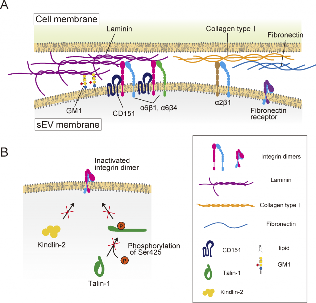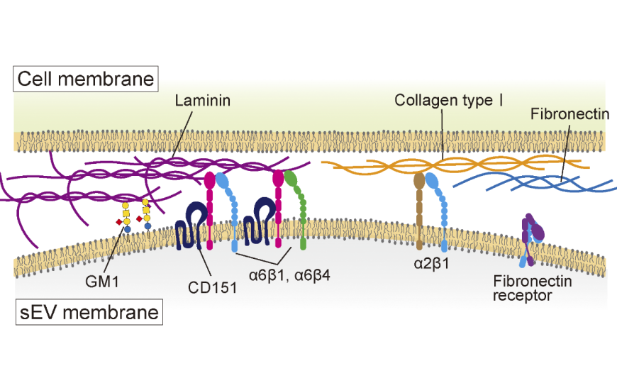 Ученые из Японии исследовали механизм прикрепления внеклеточных везикул (ВВ), производимых опухолевыми клетками, к клеткам-мишеням. ВВ связываются с ламинином — компонентом внеклеточного матрикса. В этом процессе задействованы интегрины α6β4, α6β1 и ганглиозид GM1, причем интегрины работают без классической активации; прикрепление к ламинину облегчает белок CD151. Этот механизм критичен для ангиогенеза, что делает его перспективной целью для антиметастатической терапии.