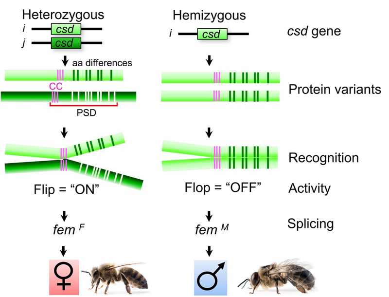 Ученые заключили, что именно взаимодействие между разными вариантами Csd при участии CC-мотивов лежит в основе формирования женского пола у пчел. Активный комплекс, состоящий из разных вариантов Csd, направляет сплайсинг fem по пути, определяющему женский пол. Напротив, гомомерный комплекс неактивен и не затрагивает регуляцию сплайсинга fem, который по умолчанию сплайсируется по мужскому пути.