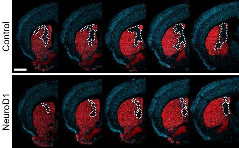 Экспрессия NeuroD1 в клетках микроглии индуцирует их превращение в нейроны, которые восстанавливают поврежденный инсультом участок стриатума (на изображении окрашен красным).