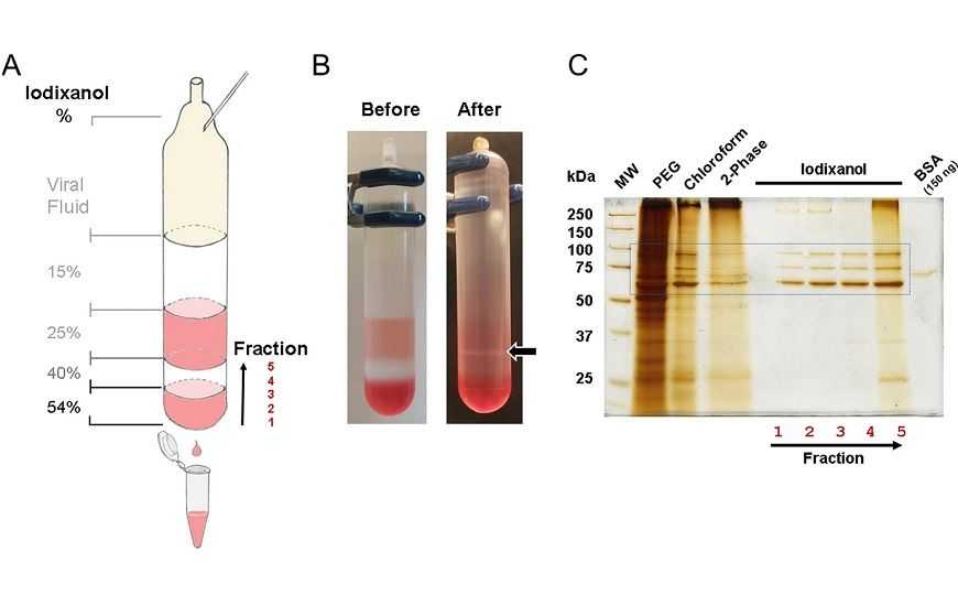 Новый протокол в первую очередь отличается тем, что вирусы выделяли не только из лизированных клеток, но и непосредственно из среды культивирования на 3-й и 5-й дни. Для этого тестировали среды разного состава и пришли к выводу, что лучше всего использовать небольшое количество глюкозы, дополнительные буферы для стабилизации рН и GlutaMAX вместо глутамина, так как глутамин приводит к образованию аммиака в среде. Также снизили количество сыворотки (fetal bovine serum, FBS) до 1% и проводили очистку методом дифференциального центрифугирования в градиенте плотности йодиксанола, так как без дополнительной стадии очистки сохраняется много лишних белков, которые могут вызвать иммунный ответ при введении ААВ in vivo.