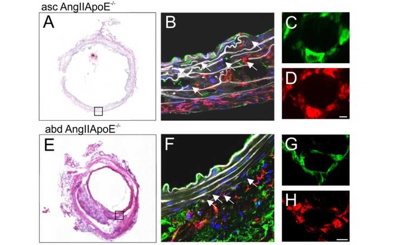 Сравнение аневризм в восходящей дуге и брюшной аорте, полученных из модели аневризмы AngII ApoE−/− на 14-й или 28-й день, с теми же участками у контрольных животных (ApoE−/− мышей без введения AngII), выявило аневризмы у большинства мышей AngII ApoE−/− в соответствующих местах (7/9 восходящих, 8/9 брюшных), которые также могли быть обнаружены с помощью ультразвукового исследования. Гистологический анализ также подтвердил увеличение просвета и образование аневризм в восходящей дуге и брюшной аорте.
