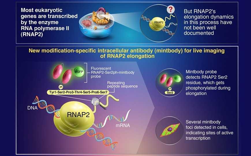 Ser2ph-связывающий флуоресцентный зонд представляет собой так называемое mint-антитело, или минтело (mintbody — modification-specific intracellular antibody внутриклеточное специфическое к модификации антитело). В клетку внедряется генетическая конструкция, кодирующая минтело. Оно включает по одному тяжелому и легкому вариабельному домену антитела, специфического к Ser2ph, а также флуоресцентный белок. Ранее технологию mint-антител авторы применяли для других целей, например, визуализации модификаций гистонов.