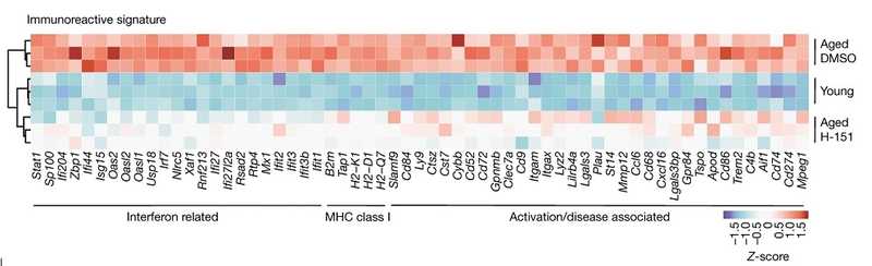 В мозге стареющих мышей была повышена концентрация цГАМФ, продуцируемой cGAS. Анализ транскриптов обнаружил более 450 генов, чья активность варьировалась в зависимости от присутствия H-151 и возраста. Основной вклад в эти возрастные изменения экспрессии вносит микроглия. Изолированная микроглия проявляла те же самые изменения активности генов.