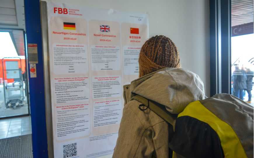 Берлин, аэропорт Шёнефельд. Информация по коронавирусу на трех языках.