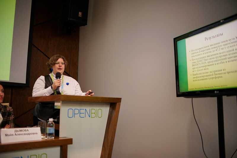 Открыл секцию «Биотехнология» доклад Марии Аксёновой (НИЦ Курчатовский институт, Москва) «Фотобиотопливный элемент на основе цианобактерий с использованием углеродной ткани и проводящего гидрогеля с использованием PEDOT:PSS и добавлением нанотрубок». Аксёнова рассказала о двухкамерной ячейке для производства электроэнергии в соответствии с концепцией зеленой энергетики. Анодная камера заполнена смесью клеток фотосинтезирующего микроорганизма — цианобактерии Arthrospira platensis с модифицированным полиэтиленгликолем и полимером PEDOT:PSS. Катодная камера заполняется PEDOT:PSS и нанотрубками. По словам Марии, на свету биотопливная ячейка производила электричество, а в темноте тока не было, что подтверждает роль жизнедеятельности цианобактерий в работе элемента.