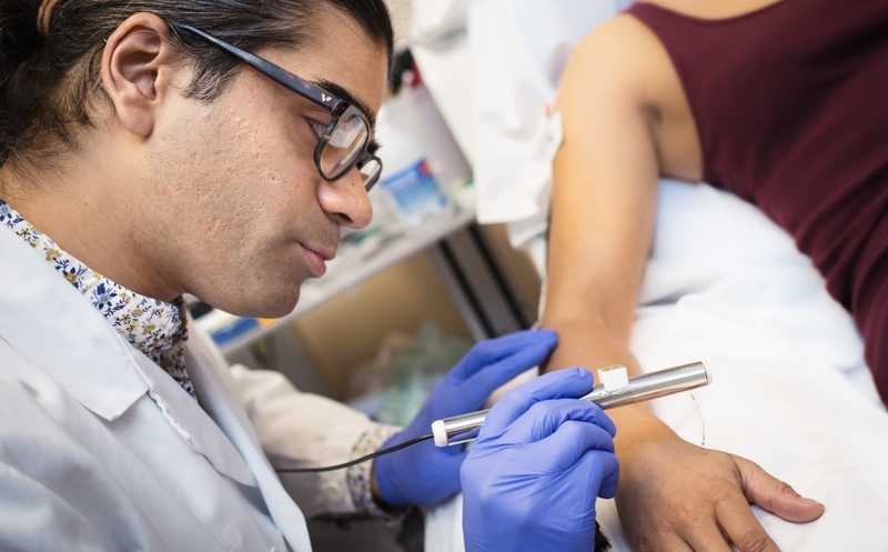 Саад Наги из Университета Линчёпинга, один из авторов работы, демонстрирует метод микронейрографии, который позволяет регистрировать сигналы отдельных нейронов.