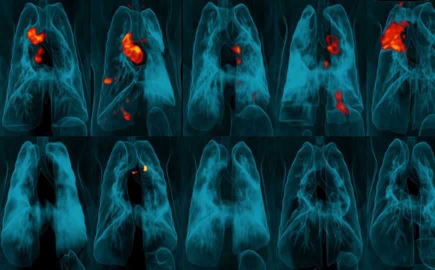 3D-сканирование методом ПЭТ-КТ легких у макак, инфицированных туберкулезной палочкой после вакцинации БЦЖ внутрикожно (верхний ряд) и внутривенно (нижний ряд). Области инфекции и воспаления показаны красным и оранжевым.
