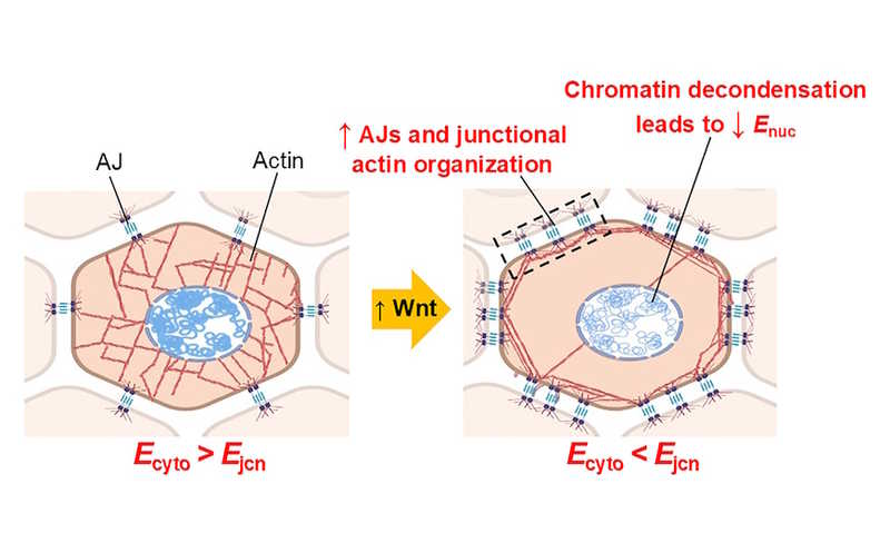 Активация Wnt-сигналинга приводит к перестройке цитоскелета: межклеточный связи делаются более прочными, центральная часть клетки — более мягкой.