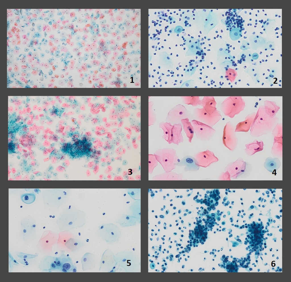 Микрофотографии мазков, полученные с помощью системы EASYPREP YD Diagnostics: 1 —негативный образец (100х), 2 — воспаление (400х), 3 — Candida (400x), 4 — поражение низкой степени риска (ASCUS, 400х), 5 — дисплазия (HSIL, 400х), 6 — плоскоклеточная карцинома (400х). Credit: YD