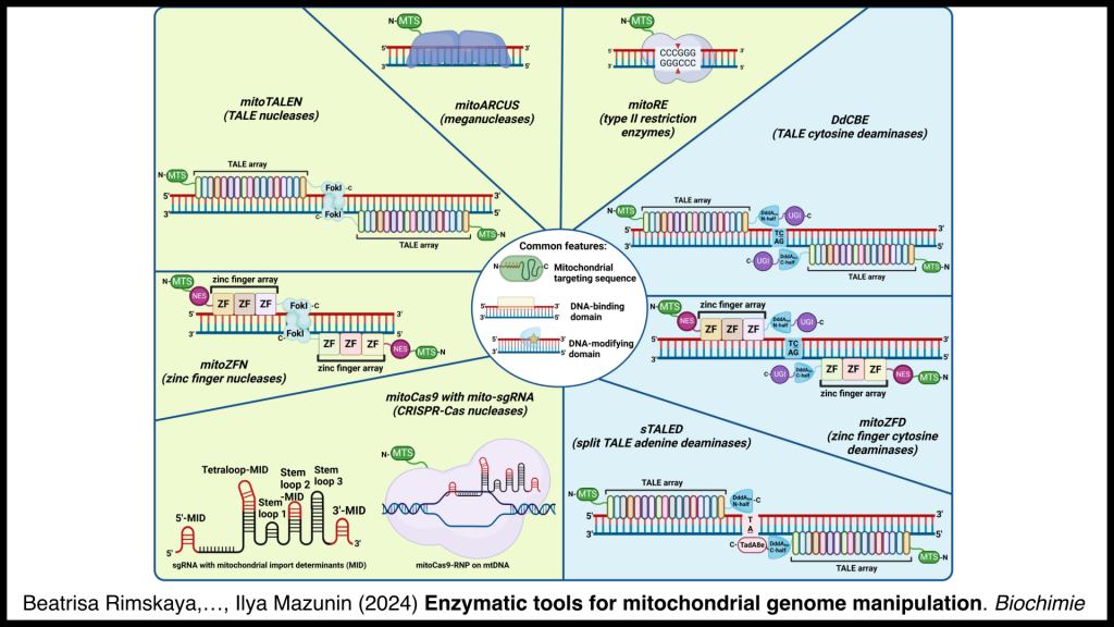 Илья Олегович привел список основных систем редактирования митохондриальной ДНК, включая нуклеазы (mitoARCUS, mitoRE, mitoTALEN, mitoZFN, и mitoCas9 с mito-sgRNA) и редакторы оснований (DbCBE, mitoZFD и sTALED).