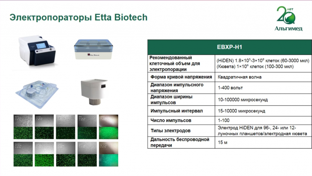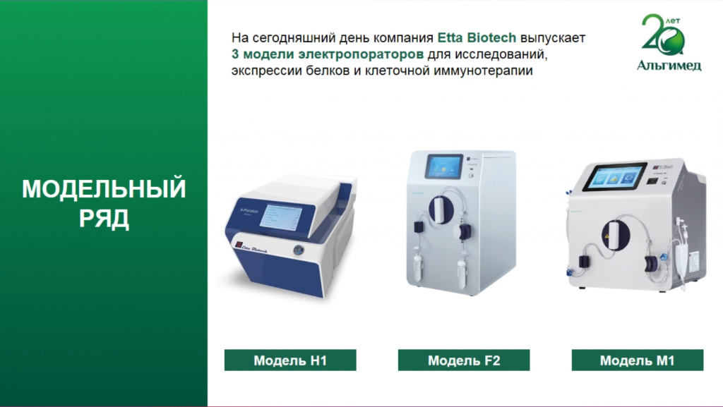 Etta Biotech — первая компания в Китае, которая специализируется на исследованиях и разработках технологии электропорации. На данный момент выпускаются три модели электропораторов: H1 (для базовых задач), F2 (открытого плана с возможностью использования сторонних расходных материалов) и M1 (закрытая система для использования в GNP производстве). В качестве демо-прибора компанией «Альгимед» был оформлен заказ на самую простую модель H1. Надежда Александровна особо отметила преимущество открытой системы данной модели в сравнении с аналогичными приборами LONZA, которые требовали расходных материалов от производителя.