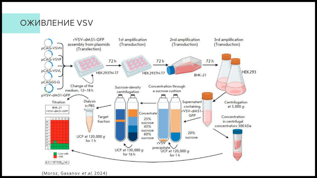 Группа Александра Владимировича занимается разработкой подобных препаратов на основе вируса везикулярного стоматита, в который встраиваются гены активации иммунитета. Докладчик описал трудоемкий процесс «оживления» вируса — клеточная линия трансфицируется смесью плазмид, что приводит к сборке вирусной частицы, которая далее реплицируется и очищается. Первый этап наиболее критичен, так как далеко не всегда получается добиться успешной сборки вирусной частицы.
