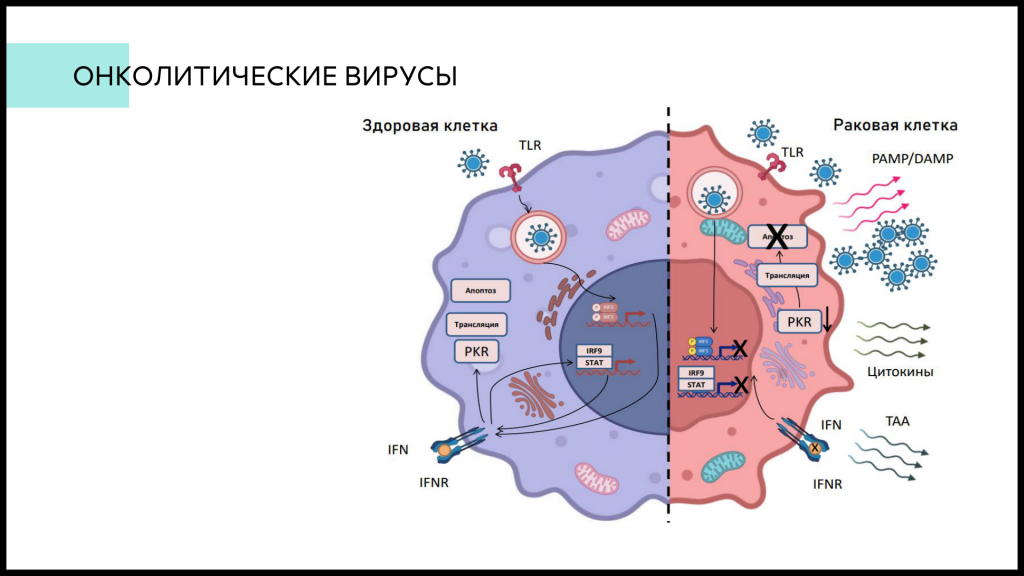 Онколитические вирусы — относительно новый класс препаратов; это вирусы, способные реплицироваться в раковых клетках, но при попадании в здоровые клетки они элиминируются механизмами противовирусного ответа. Онколитические вирусы могут не только вызывать лизис раковых клеток, но и синтезировать в них определенные белки, направленные на активацию противоопухолевого иммунного ответа, который будет подавлять и рост метастазов вдали от опухоли.