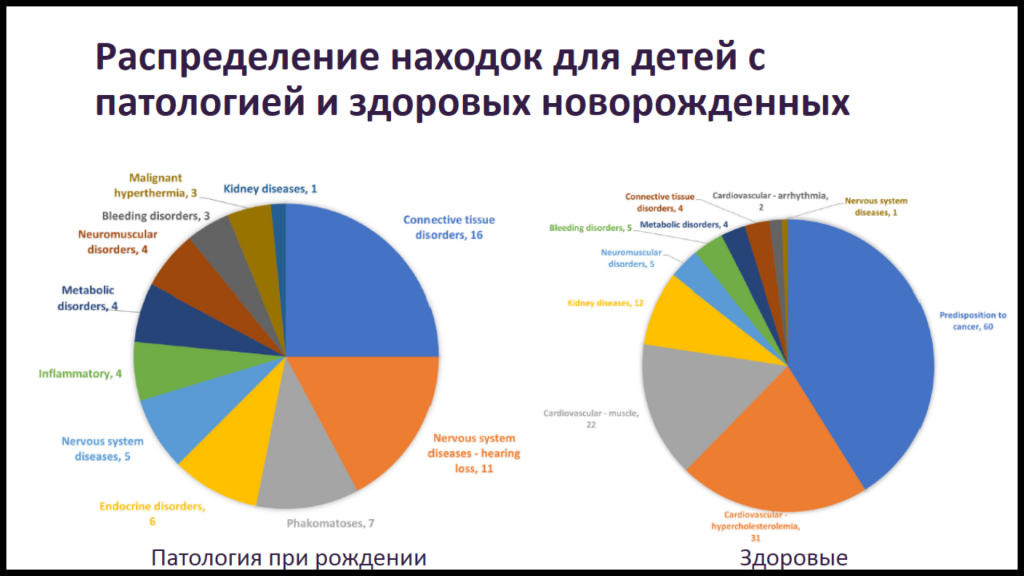 В Центре Кулакова уже три года функционирует проект скрининга новорожденных методом полного экзомного секвенирования ЭКЗАМЕН — Экзомный Клинически Значимый Анализ Мутаций Единичных Нуклеотидов (о некоторых его предварительных итогах на PCR.NEWS). В рамках проекта было собрано 13000 образцов пуповинной крови. Для 11000 из них был получен полный экзом. По данным первых 7000 новорожденных была опубликована статья: 3% новорожденных имели серьезные генетические заболевания. Такую высокую долю докладчик объяснил тем, что в центре наблюдаются преимущественно беременные женщины с высоким риском, в том числе и генетических нарушений.