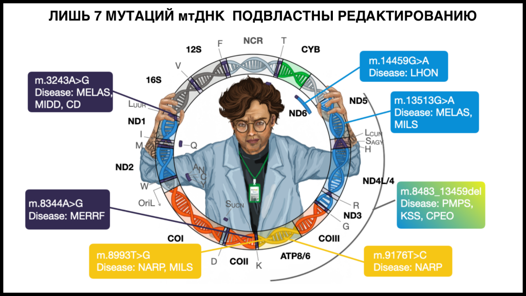 Несмотря на широкий арсенал методов редактирования, из 96 подтвержденных патогенных мутаций мтДНК до сих пор лишь семь удалось отредактировать на практике; в теории возможно редактирование 86 мутаций. Все семь были исправлены путем внесения двуцепочечных разрывов в мутантную ДНК и ее дальнейшей деградации. В отличие от ядерной ДНК, в митохондриях невозможно починить двуцепочечный разрыв с помощью гомологичной рекомбинации или негомологичного соединения концов, мутантная мтДНК с разрывами просто деградируется специальными ферментами.