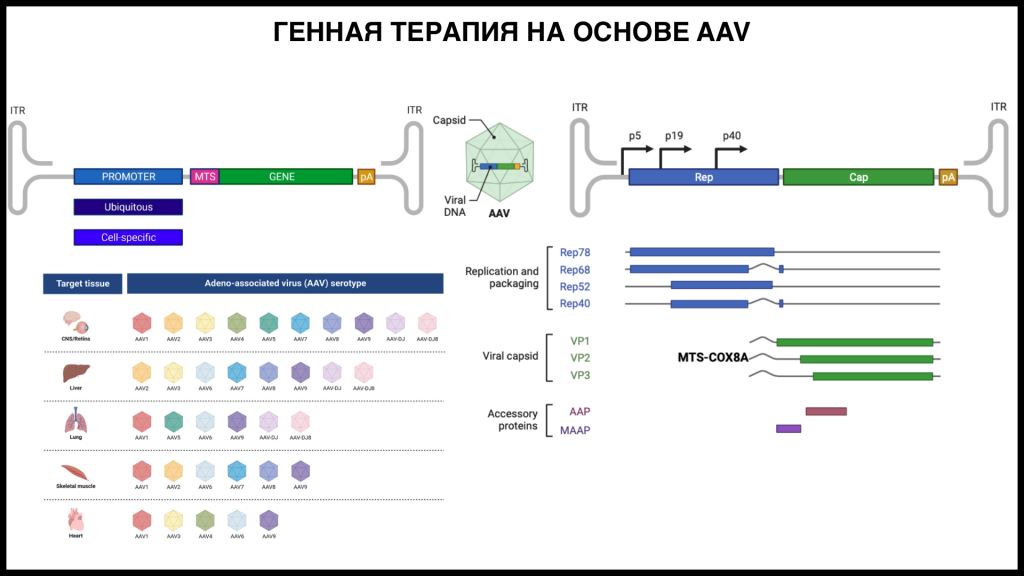 Заместительная терапия заключается в доставке в митохондрии «правильных» вариантов мутантных генов. При этом существуют два подхода. В первом случае AAV доставляет в клетку митохондриальный ген без мутации, кодоноптимизированный под трансляцию на рибосомах цитоплазмы; белок транслируется в цитоплазме и затем транспортируется в митохондрии. Во втором случае один из капсидных белков AAV модифицируется — к нему добавляют сигнал митохондриальной локализации; вирусные частицы проникают внутрь митохондрий, где и происходит трансляция белка. Добиться успешного применения второго подхода у группы Ильи Олеговича не получилось, хотя этот подход показал эффективность в ряде клинических исследований.