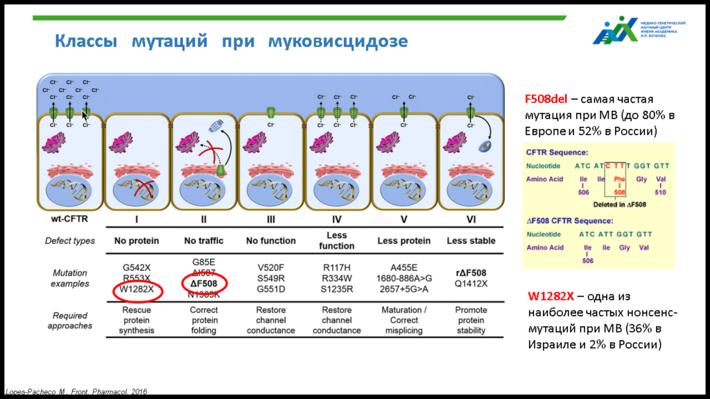 Так, при мутации W1282X, относящейся к наиболее тяжелому первому классу, отсутствует сам белок ионного канала. При мутациях второго класса, например, ∆F508, белок образуется, но имеет неправильную структуру и быстро деградирует. Начиная с третьего класса мутаций белок выходит на апикальную поверхность клетки, но не функционирует либо функционирует плохо. Коллектив Светланы Анатольевны сосредоточился именно на мутациях W1282X и ∆F508 как наиболее распространенных (2% и 52% мутаций у больных в РФ) и тяжелых.