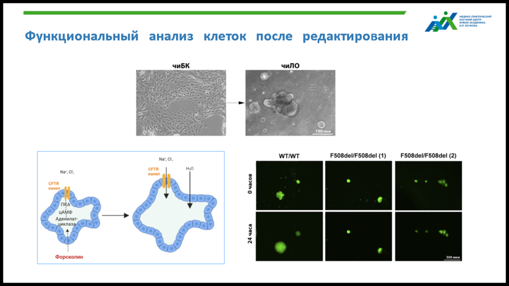 В лаборатории также был отработан метод создания из базальных клеток 3D органоидов легкого, исследование которых позволяет подтвердить, что редактирование мутантного аллеля восстановило функции ионного канала. Для этого к культуре добавляют форсколин, который при нормальной работе CFTR канала вызывает набухание органоида. Для ряда вариантов редактирования наблюдалось значимое увеличение объема органоидов в сравнении с контрольными мутантными клетками, то есть ионный канал работал нормально.