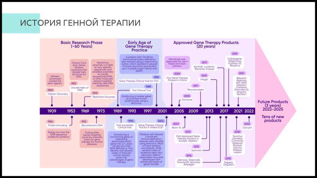 Александр Владимирович напомнил основные вехи истории генной терапии — от фундаментальных генетических открытий в начале XX века к первым пациентам, получившим генную терапию в 90-х годах XX века, и до современных разработок.