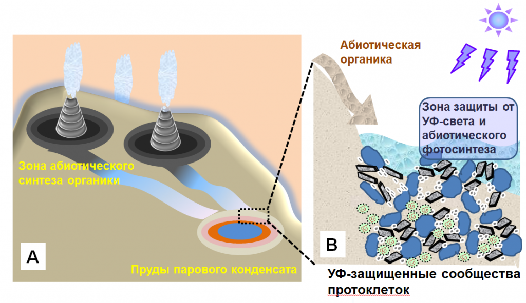 Возможная эволюция протоклеток на бескислородном геотермальном поле (PNAS USA, 2012, 109: E821-30, с изменениями). Слева — сконденсированный пар стекает по склону конуса термального источника; при нейтральном рН сульфиды меди, свинца и железа быстро выпадают в осадок (серые круги), тогда как ионы магния и цинка остаются в жидкой фазе. В понижениях рельефа образуются водоемы, обогащенные цинком и магнием, их дно покрывается слоями ZnS-содержащих силикатных минералов. Справа — протоклетки в водоеме. Они питаются органикой, приносимой паровым конденсатом, и продуктами абиотического фотосинтеза, при этом сами обитают в более глубоких, защищенных от УФ-излучения придонных слоях