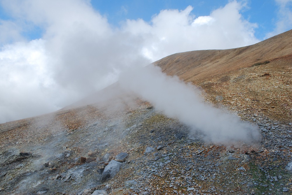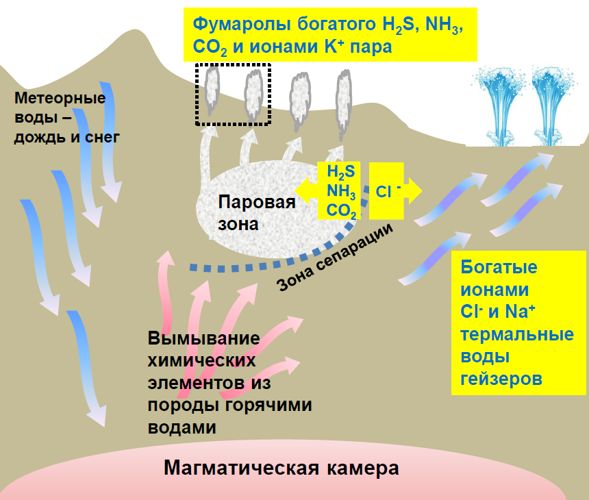 И мы с Андреем Бычковым стали искать, есть ли какие-то современные места, где ионы калия в воде преобладают над ионами натрия. В итоге оказалось, что в геотермальном паре, геохимию которого Бычков и изучает, больше калия, чем натрия. Что есть геотермальный пар? Магматическая камера, обычно относящаяся к вулканической системе, нагревает грунтовые воды до порядка 400 °С, они становятся легче и поднимаются вверх, оставаясь жидкими из-за большого давления. Этот «рассол» температурой в 300–400 °С по дороге вымывает из породы всё, что может вымыть. По мере приближения к поверхности давление падает, и рассол начинает кипеть. И тогда может происходить фазовое разделение, сепарация — пар всегда идет вверх, а жидкая фаза ведет себя по-разному в зависимости от структуры пласта. Поэтому пар обычно выходит прямо над магматической камерой, образуя геотермальное поле, покрытое выбрасывающими пар фумаролами, а жидкость гейзерами может бить и в другом месте.