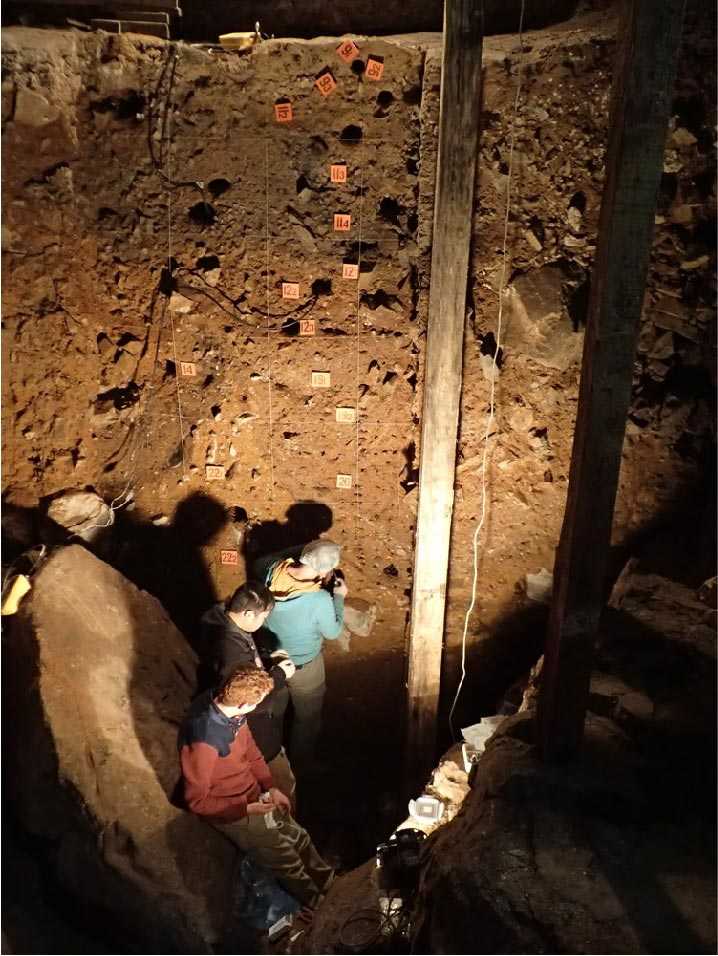 Сбор образцов отложений в Главной камере Денисовой пещеры. Credit: Richard G. Roberts |
