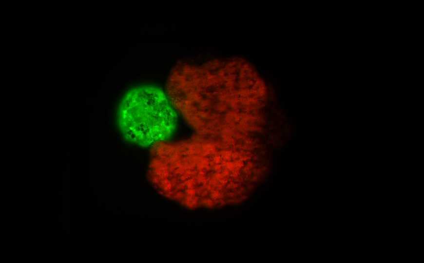 Организм-предшественник (красный) собирает стволовые клетки в агрегат (зеленый). Credit: Douglas Blackiston and Sam Kriegman |