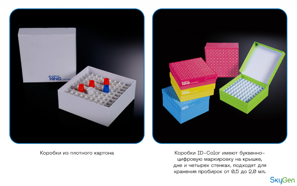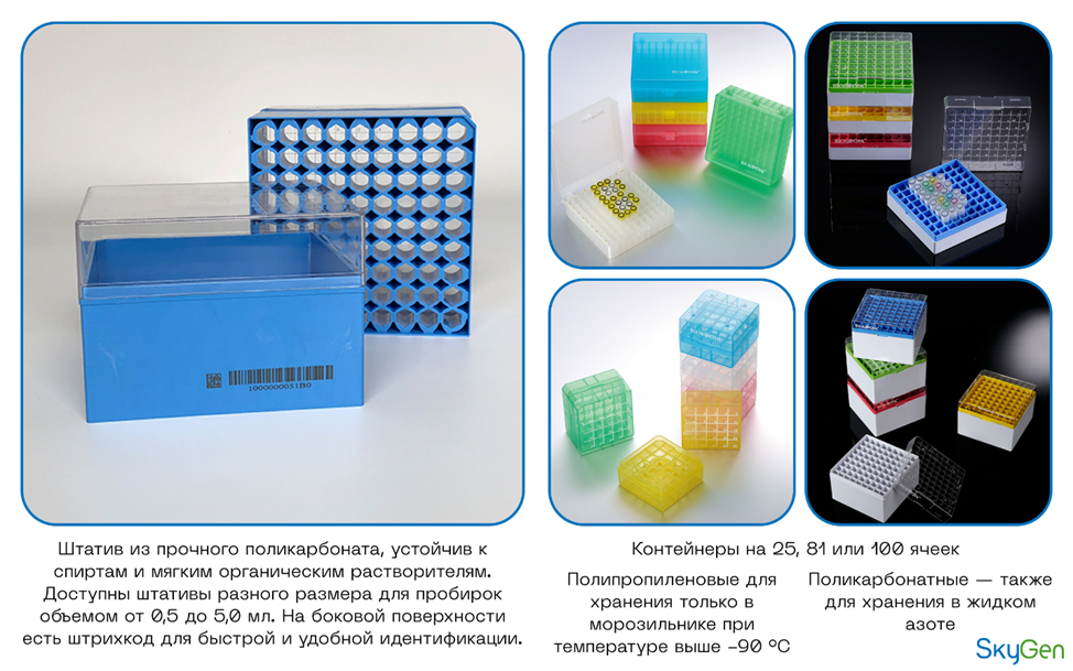Для удобного хранения необходимы еще специальные контейнеры и штативы, например, изготовленные из прочного поликарбоната, который устойчив к спиртам и мягким органическим растворителям. Данные штативы выдерживают многократное замораживание и размораживание, подходят для хранения в морозильных камерах или жидком азоте и имеют универсальные варианты исполнения на 25, 81 или 100 ячеек.