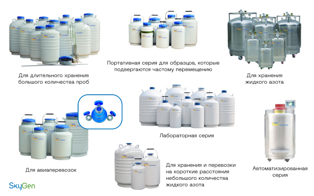 Для длительного хранения проб в больших или малых количествах существуют резервуары различных объемов. Переносные сосуды Дьюара предназначены для образцов, которые подвергаются частому перемещению. Они экономичны, практичны, легки и защищены изоляцией. Также существует серия, которая подходит как для длительного хранения, так и транспортировки образцов. Для авиаперевозок биоматериала есть отдельный вид сосудов Дьюара, конструкция которых препятствует утечке жидкого азота во время транспортировки.
