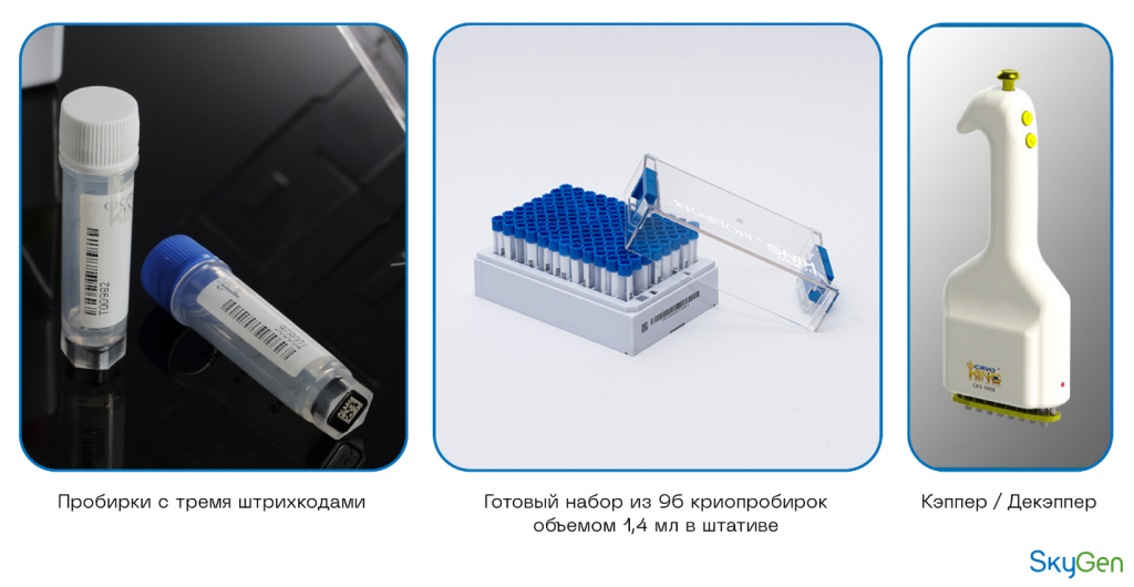 Существует большое разнообразие решений, удобных для автоматизации, в том числе и в области криохранения. Например, пробирки с тремя штрихкодами могут быть объемом от 0,5 до 5 мл, с внешней или внутренней резьбой. На дно каждой пробирки нанесен 2D-штрихкод, а на боковую сторону — 1D-штрихкод и номер. Такие пробирки подходят для штативов стандарта SBS (Society for Biomolecular Screening).