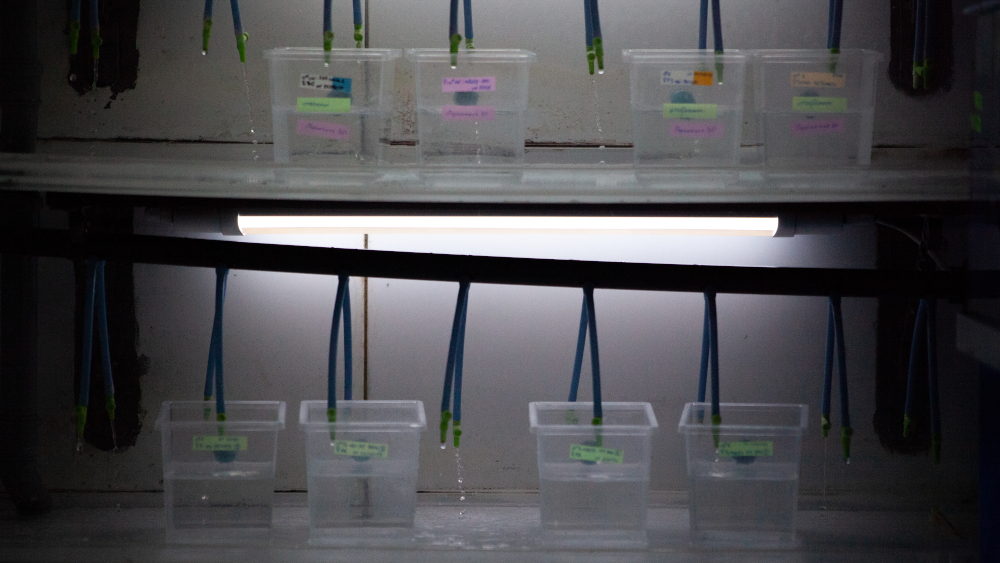 — Эту стойку тоже собрал наш умелец. Она совсем простая: трубки, отвод, капельная подача и корытца с рыбами, купленные на условном вайлдберриз. Рядом емкости, в которых мы разводим парамеций на корм малькам. Сначала мальки питаются исключительно за счет желточного мешка, но на пятый день у них открывается рот. Правда, употреблять они могут только маленькую пищу, поэтому сначала их кормят инфузориями. Рачков артемий — корм для взрослых рыб — им начинают давать, когда они подрастают, обычно к десятому дню жизни.