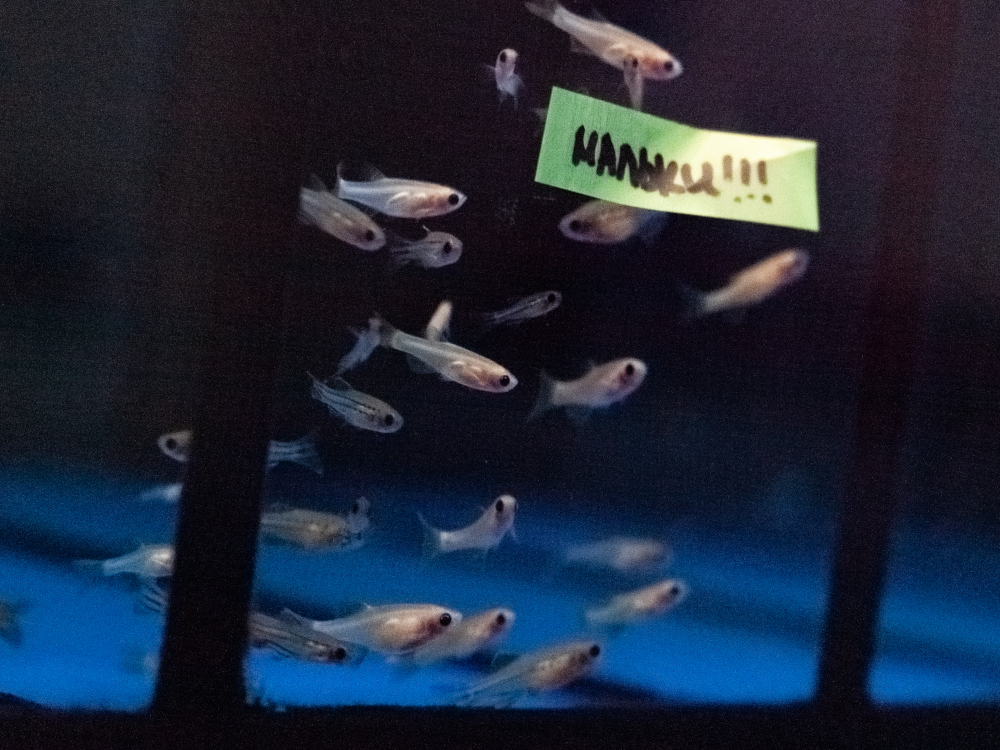 Анастасия отлавливает пару пятидневных трансгенных мальков, экспрессирующих в тканях флуоресцентный SypHer3. Мальки выводятся из икринок в «рыбьих яслях» и первое время обитают отдельно — подсаживать их к взрослым рыбам чревато, в частности, тем, что слишком мелкий малек может покинуть пределы аквариума по системе подачи воды и тем самым испортить результаты выведения какой-нибудь экспериментальной линии. Если, конечно, взрослые рыбы не съедят его раньше — такой риск тоже существует.