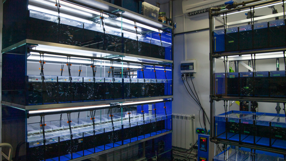 Помещение занимают две стойки почти до потолка, в каждой — ряды тех самых аквариумов-отсеков с модельными рыбками. Все маркировано наклейками: линия, поколение, экспрессия того или иного трансгена.