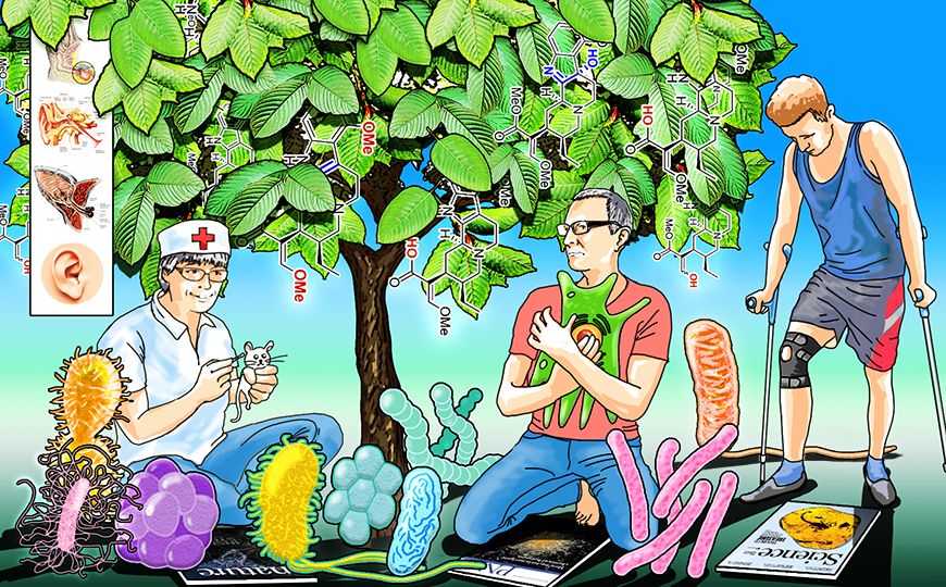 11. Дерево кратом (Mitragyna speciosa) произрастает в Юго-Восточной Азии, его листья давно применяются в традиционной медицине, в том числе как легкий наркотик, стимулирующее и обезболивающее средство. Его потребление растет в США и Европе, при этом он недостаточно исследован, эффективность и безопасность не доказаны. Ранее основным активным веществом листьев кратома считался алкалоид митрагинин, который взаимодействует с опиоидным рецептором, но с ним также взаимодействует другой алкалоид, 7-гидроксимитрагинин (7-ОН). Авторы статьи в ACS Central Science в экспериментах на клетках in vitro и животных показали, что за анальгезирующий эффект отвечает в основном 7-ОН. В листьях его гораздо меньше, чем митрагинина, однако клетки печени мыши и человека превращает митрагинин в 7-ОН, то есть действие препарата может зависеть от метаболизма пациента и от пути введения.