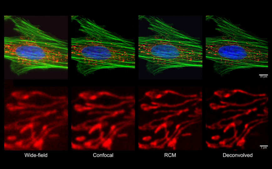 Тут вы видите изображения клеток, которые я получил на различных микроскопах. Я увеличил небольшой участок клетки. Вот изображение с широкопольного микроскопа, а вот конфокального с ФЭУ-детектором – видите, изображение четче. А вот то же, снятое на RCM. Мы можем увидеть тут больше деталей, а справа изображение еще улучшено после деконволюции.